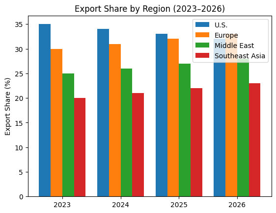 This conceptual graph suggests a relative shift away from concentrated dependence on the U.S. as Europe, Middle East, and Southeast Asia capture larger export shares.